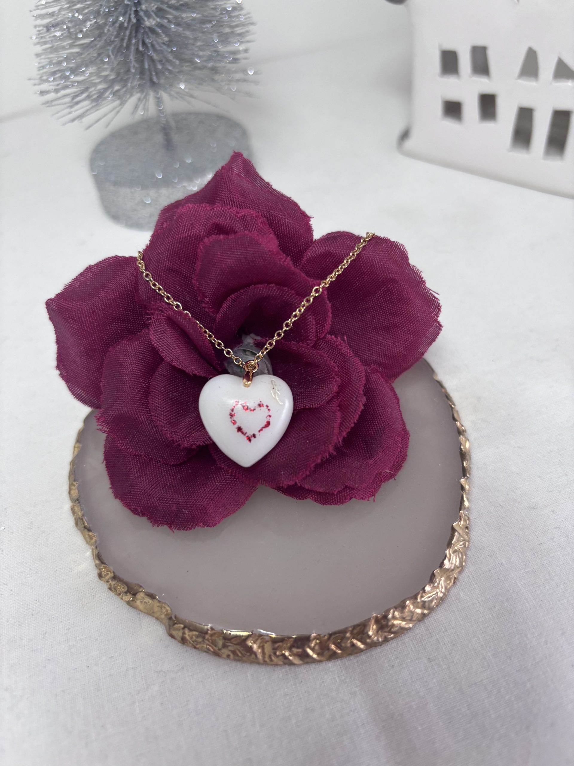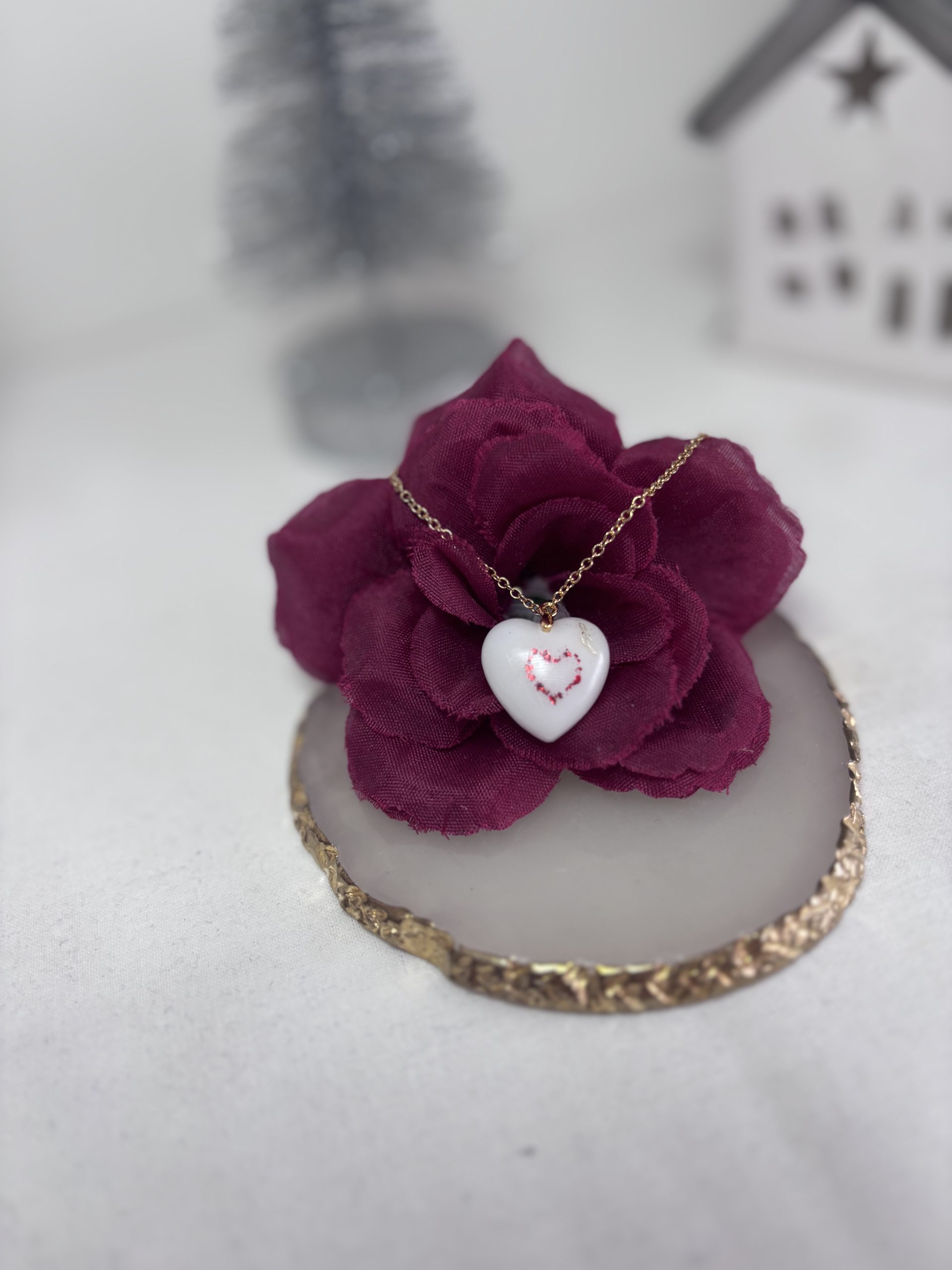 Un cœur de lait, un cœur rouge, des éclats précieux… et toute une histoire d’amour maternel encapsulée dans un bijou.
